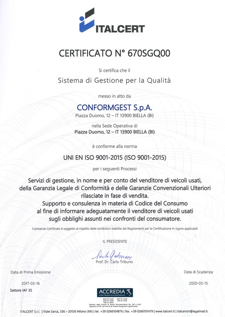 La búsqueda de la mejora constante que ha caracterizado el crecimiento de ConformGest en el transcurso de sus 9 años de actividad, ha permitido en Marzo 2017 conseguir una meta importante: la certificación UNI EN ISO 9001 – 2015 por parte del organismo cualificado ITALCERT